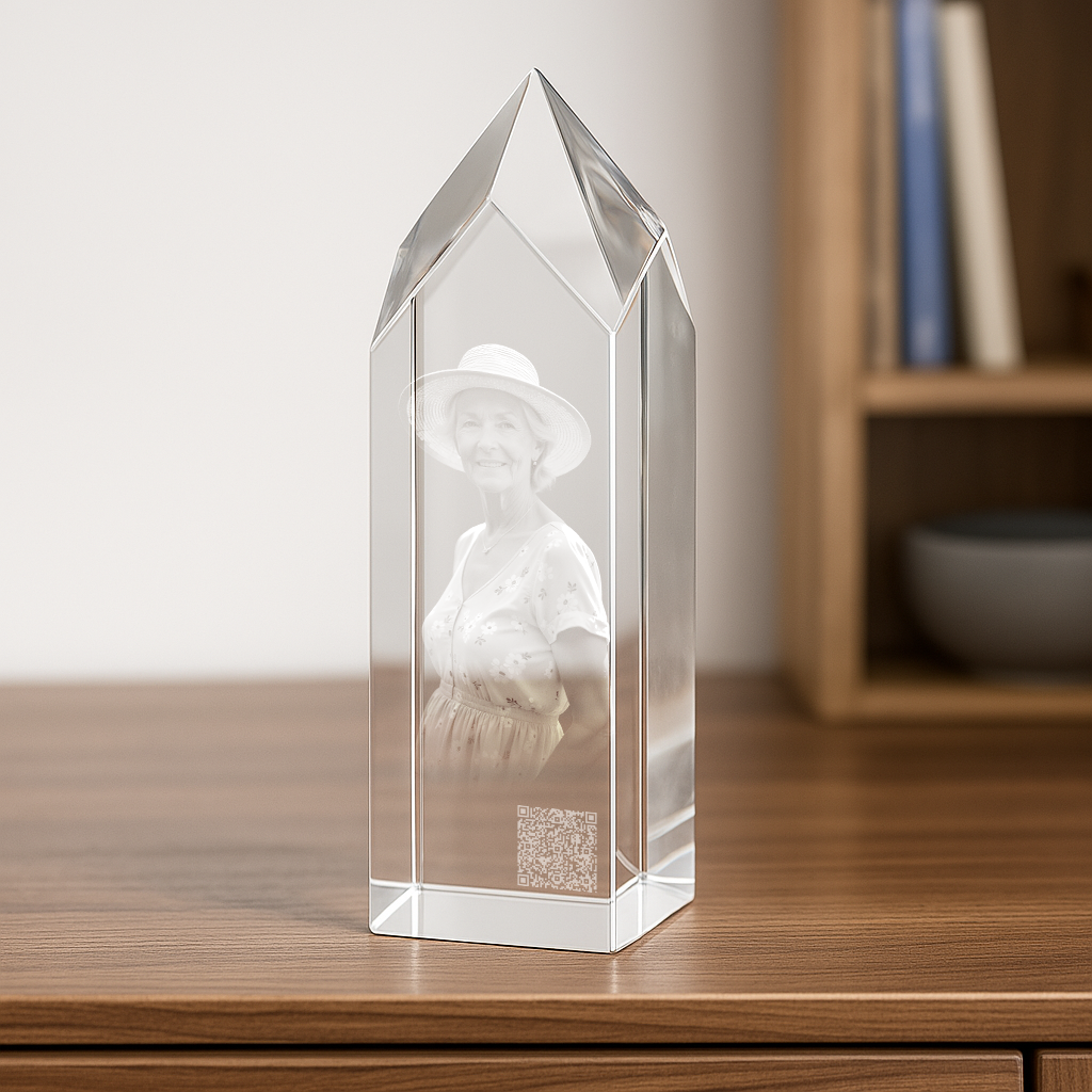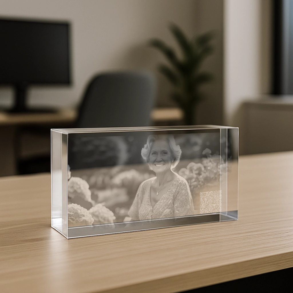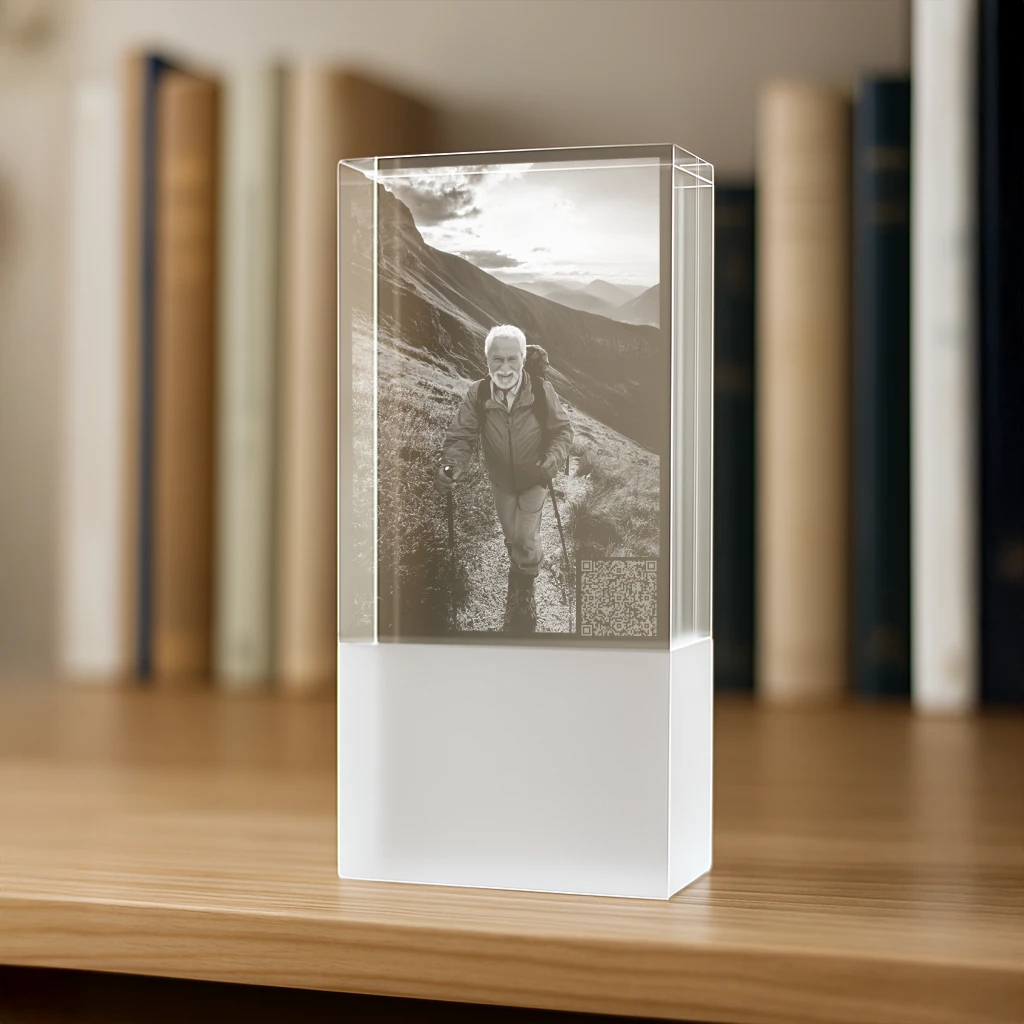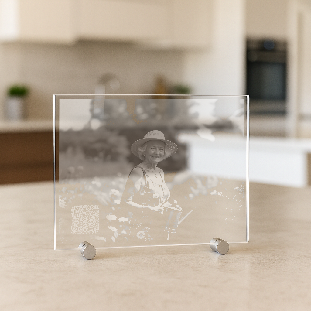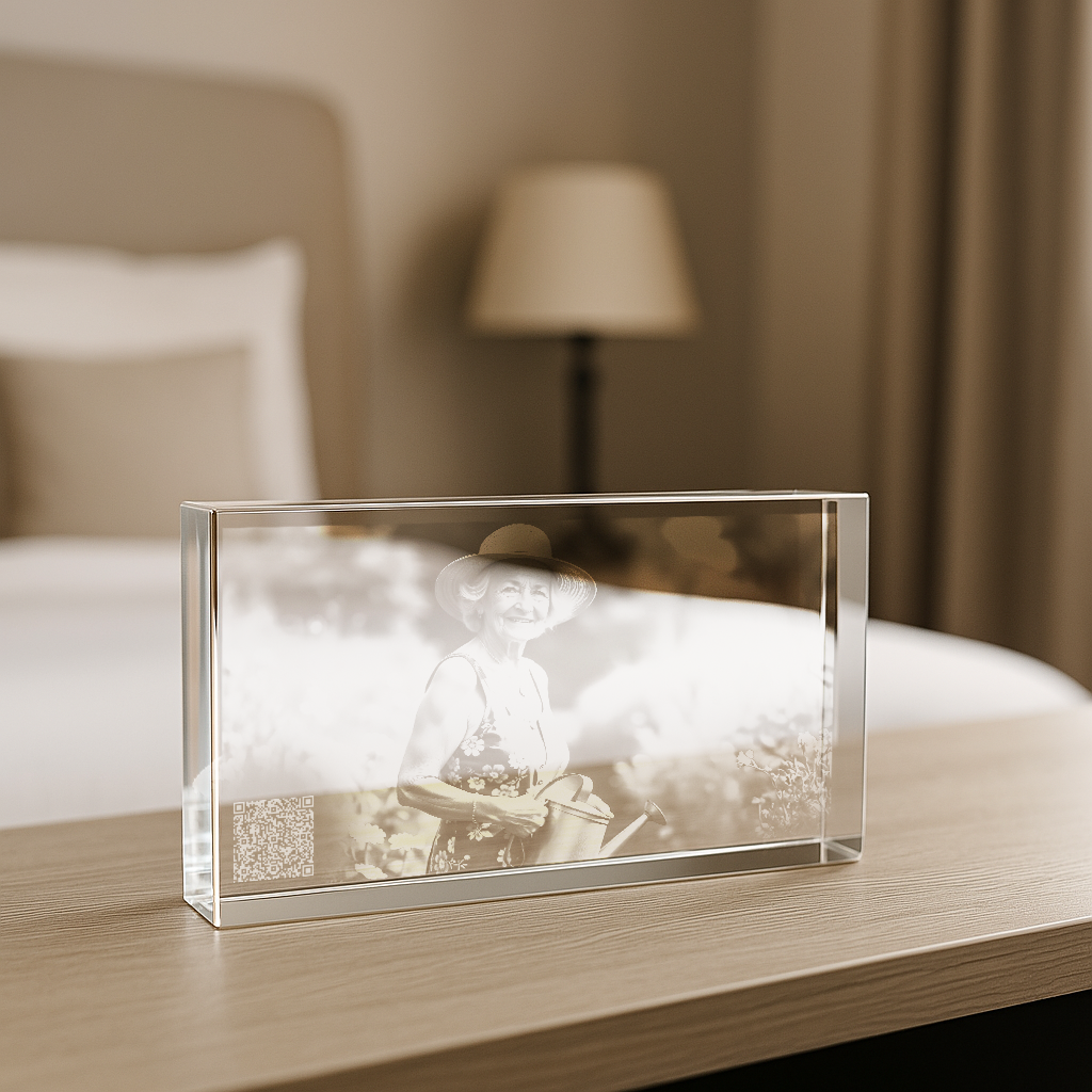 Der Zugang erfolgt ganz einfach über einen einzigartigen, nur für dich erstellten QR-Code, eingelasert oder aufgeklebt auf einem hochwertigen Kristallglas zusammen mit einem Portrait der verstorbenen Person oder deines Tieres. Scannst du ihn mit deinem Smartphone, gelangst du und deine Familie sowie deine Freunde direkt zur Gedenkseite.