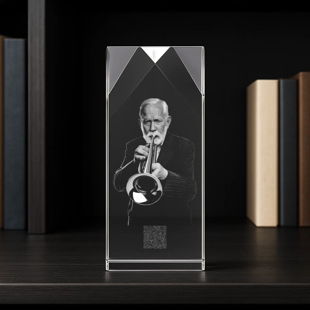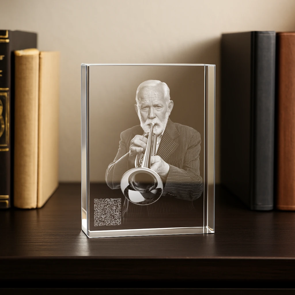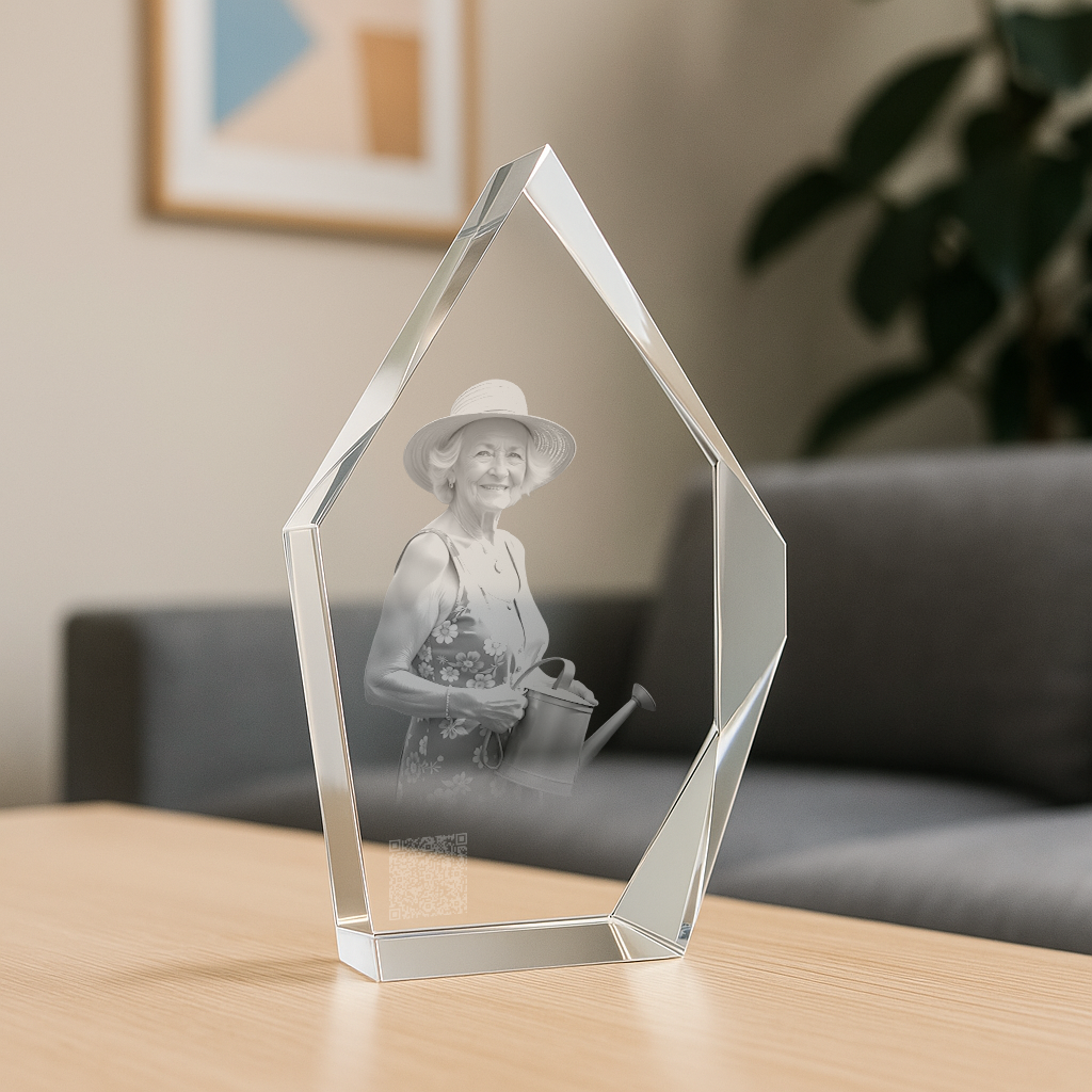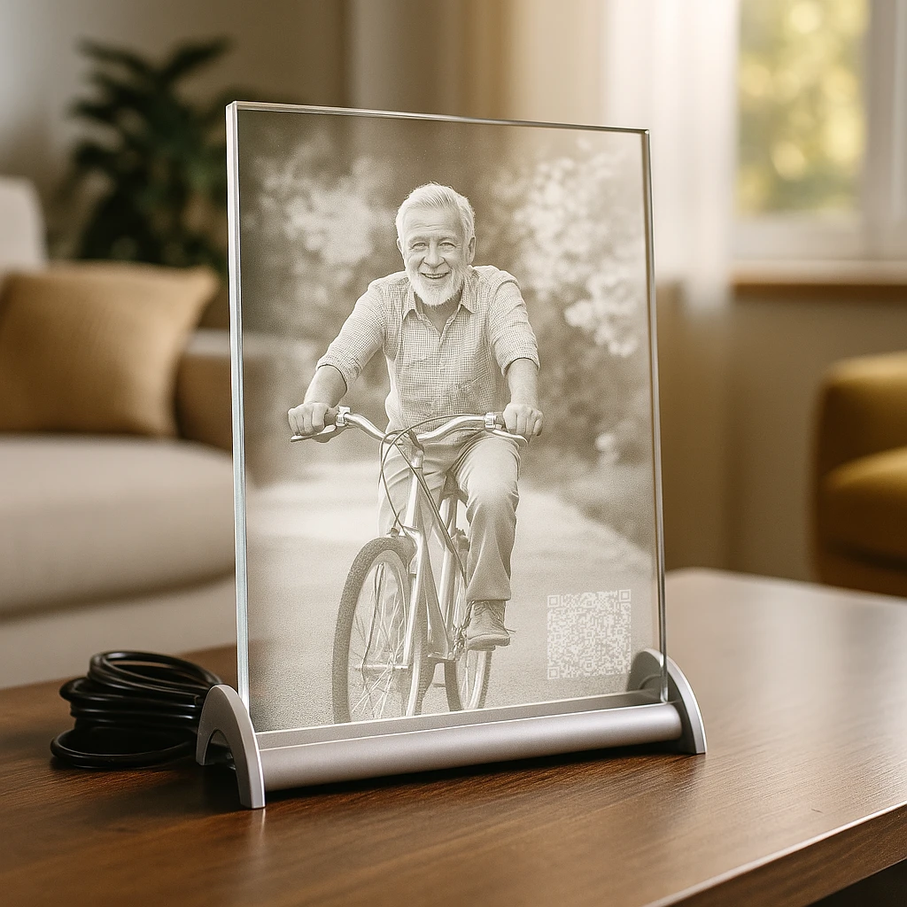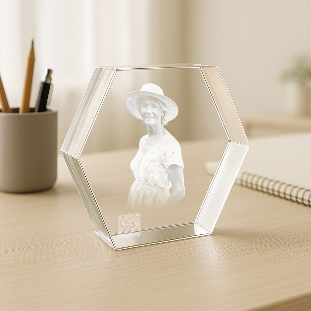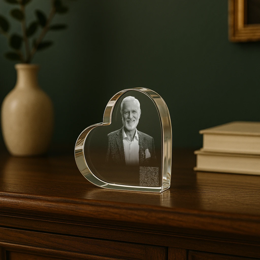Der Zugang erfolgt ganz einfach über einen einzigartigen, nur für dich erstellten QR-Code, eingelasert oder aufgeklebt auf einem hochwertigen Kristallglas zusammen mit einem Portrait der verstorbenen Person oder deines Tieres. Scannst du ihn mit deinem Smartphone, gelangst du und deine Familie sowie deine Freunde direkt zur Gedenkseite.